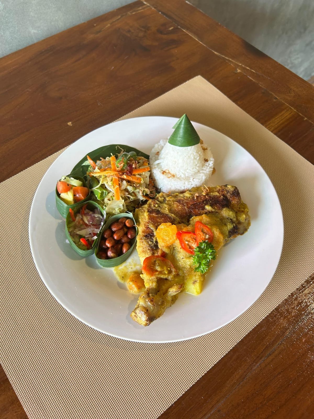 Steamed chicken leg with aromatic spices, served with steamed rice and balinese vegetables urab