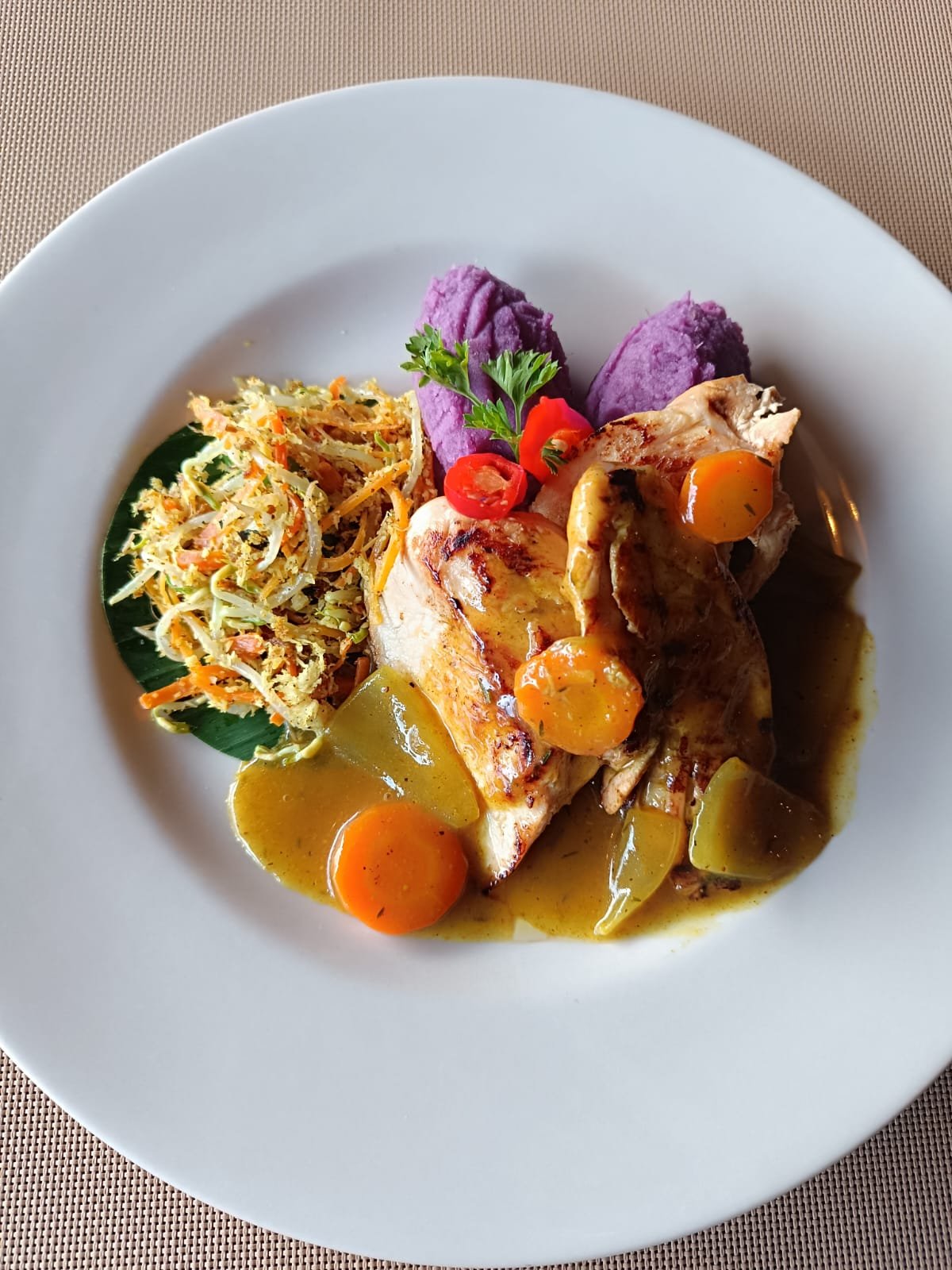 Grill chicken breast, mix vegetable urab with Balinese Curry sauce served with sweet mashed potatoes