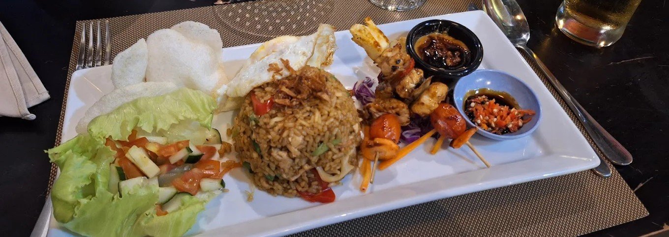 Indonesian chicken fried rice served with chicken skewer and peanut sauce, fried egg, creakers.